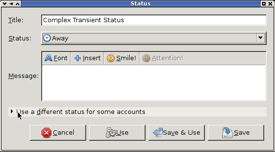 Creating a Complex Saved StatusA complex saved status is where the real power of saved statuses becomes obvious. Let's modify the existing away example we created. Select it in the saved status list and click "Modify..." Now click the expander just to the side of "Use a different status for some accounts" and observe the list of accounts that appears.